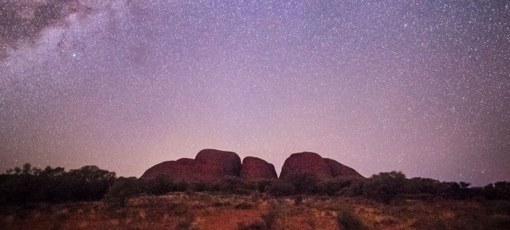 Just a short distance from Uluṟu, Kata Tjuṯa reveals its own unique magic beneath the stars. Each of its domed formations holds ancestral significance, and as the night sky glows overhead, the area feels alive with the spirit, history, and cultural heritage embedded within the land. Together, these sacred places offer a stargazing experience that is not only visually breathtaking but also deeply enriching.